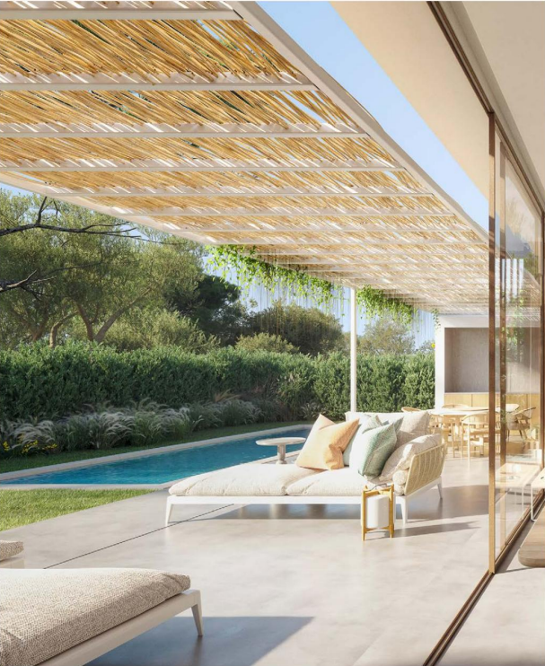 Elke villa beschikt over twee eigen pergola parkeerplaatsen, buitenbergingen, een groot overdekt terras met barbecue, een buitenbadkamer en een zwembad.